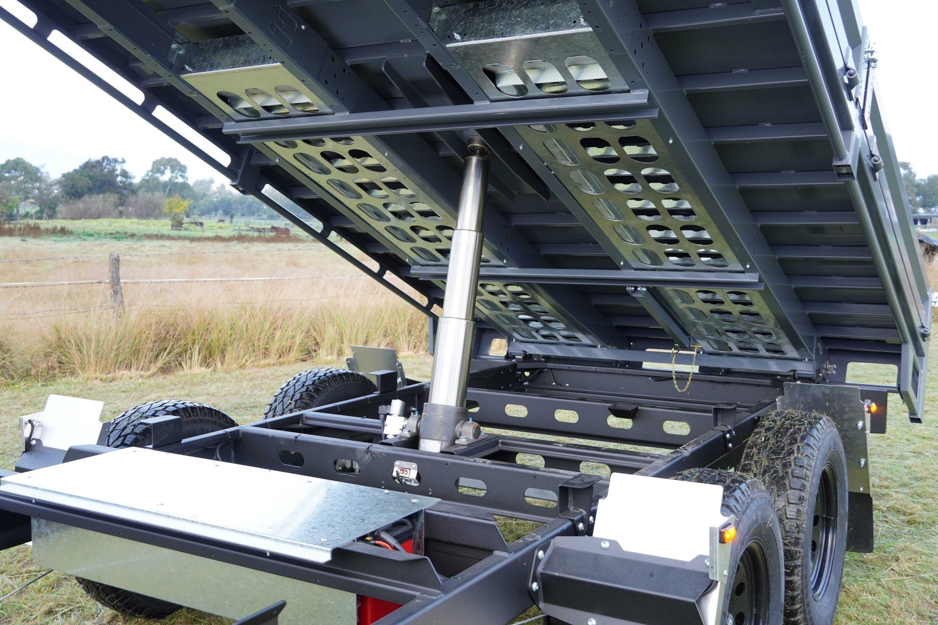 The main design feature of the Tipper Trailer fabricated chassis is the 5mm 350* grade steel C-Section Channel that runs the full length of the trailer allowing the sub frame to flex and move as it negotiates rough road terrain.